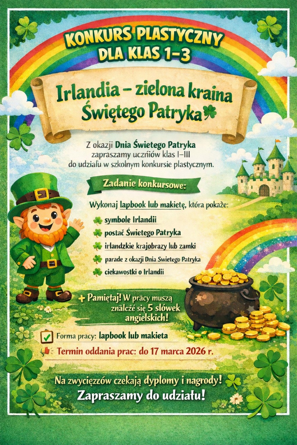 Nauczyciele języka angielskiego serdecznie zapraszają chętnych uczniów z klas 1-3 do wzięcia udziału w szkolnym konkursie z okazji Dnia Świętego Patryka.